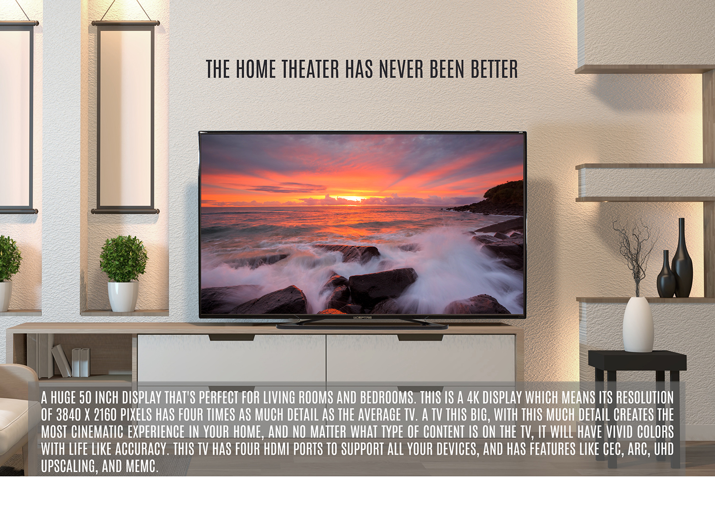 Register a free business account. The sceptre u500cv-umk 49 4k ultra hd 60hz class led hdtv features a brilliant 4k ultra hd picture for your viewing pleasure. HDMI 20 Explore all the 4K content that you want without sacrificing streaming performance.
